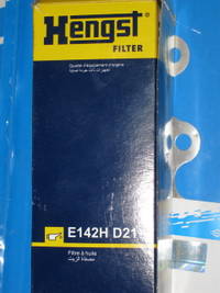 В коробке фирмы Hengst лежит резиновое уплотнительное кольцо и точно такой же, один в один маслянный фильтр (естественно Hengst номер E142H D21) только на нём не нанесена надпись MB со звездой и мерсономером (именно не нанесена, а не стёрта). Фото самого фильтра нет он работает, так что поверьте на слово. Коробки так же идентичны, впечатление, что сделаны по одному лекалу, отличие только в полиграфии.