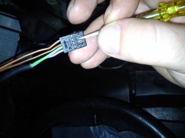 Старая желтая фишка извлекается "изнутри наружу", то есть с лицевой стороны у нее упоры, а сзади защелки. Необходимо подобраться к этим защелкам, сжать их и протолкнуть фишку вперед. Для этого я демонтировал "стрекозу"(подрулевые переключатели). Кожух с желтой фишки можно снять выдавив ее "содержимое" через круглое отверстие сбоку