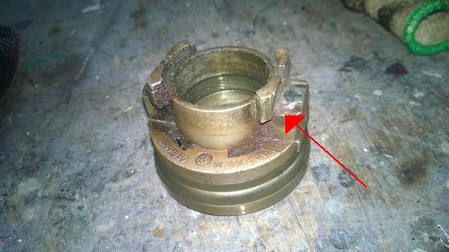 Подвели меня немного с гаражом на выходные, по итогу попал только в среду вечером  :ah: За два вечера коробка была снята. Из того, что можно сказать уже: подшипник маховика под замену. Выжимной по ходу тоже, т.к. обломана одна скоба (на фото стрелкой указана). Обидно, ведь еще без люфта и имхо в довольно хорошем состоянии.