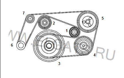 2)Ура,ремень снят.Теперь ставим на место.Надеваем поочередно на ролики 3,4,5,1,6,7.Т.е. у нас ремень надет но не натянут на ролик номер 2.
