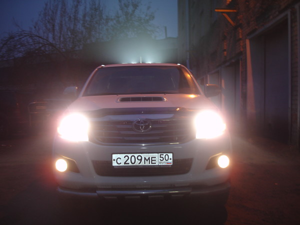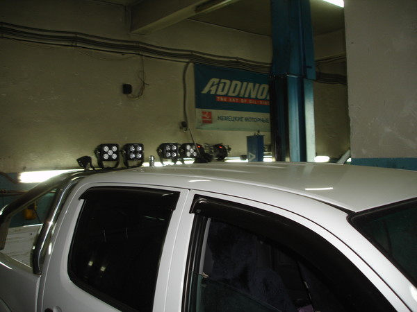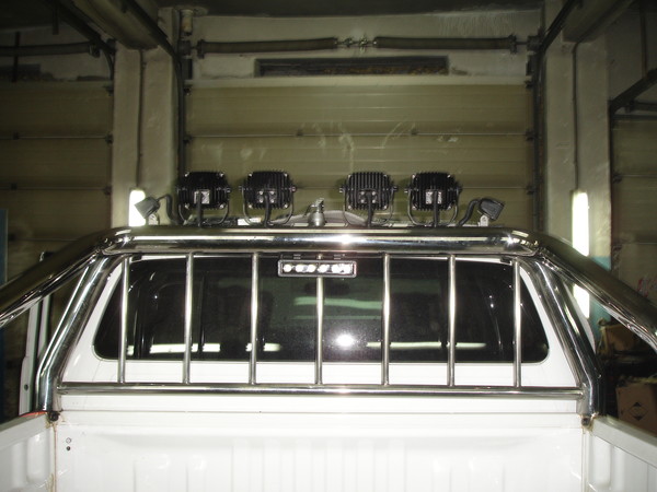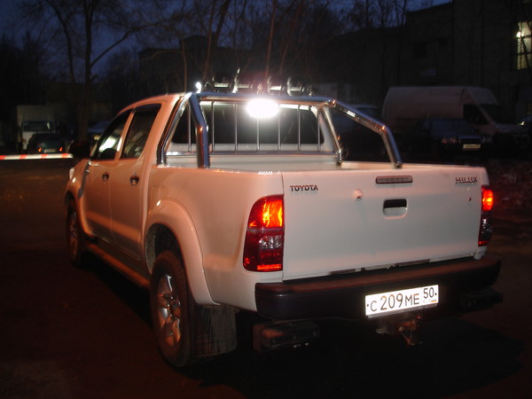 Установил верхний свет на нового хайлюкса, все провода спрятаны в трубе, кнопки использовались оригинальные. Весь свет пролайтовский. Балка под фонари самодельная из нержавейки.
