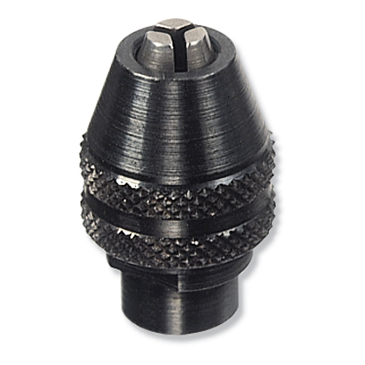 Просто резьба. Наворачивается на штатный вал, он, при накручивании, давит на шайбу, которая толкает зажимы. Они скользят по конусу и сближаются. Т.е., чем дальше накрутить на вал, тем меньше расстояние между зажимами. Как то так.