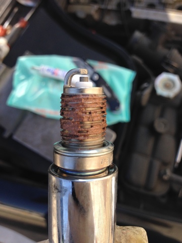 Зазор между электродами очень большой. Изолятор в нагаре. Сменить свечи и заправку и не экономить на бензине - в твоем слишком много присадок, новые свечи тоже быстро умрут.