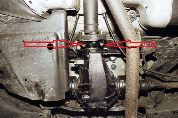 Сначала надо скинуть кардан, если есть помощник, то достаточно открутить три болта (два из них указаны стрелками, третий сверху), Если же решили делать в гордом одиночестве - то скинуть кардан вместе с муфтой будет проблематично, проще будет открутить все 6 болтов и скинуть гардан с муфты, а затем уже снять и муфту.