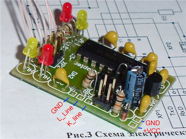на VCC паяй красный провод, а на K_Line цепляй желтый провод и все готово...